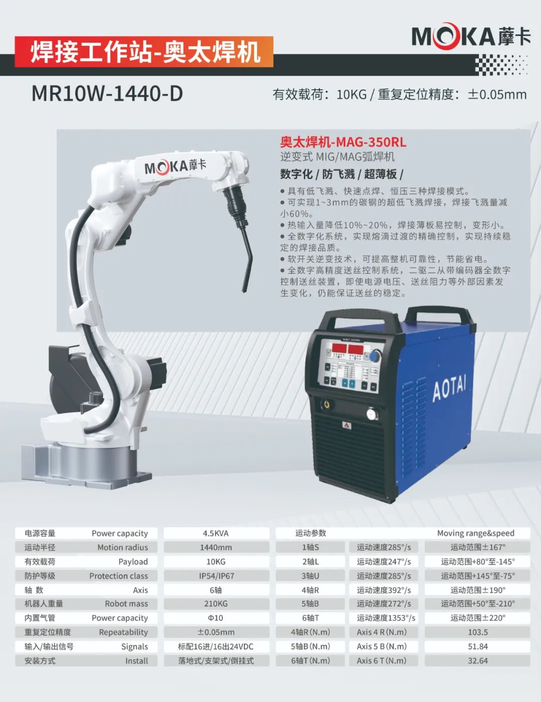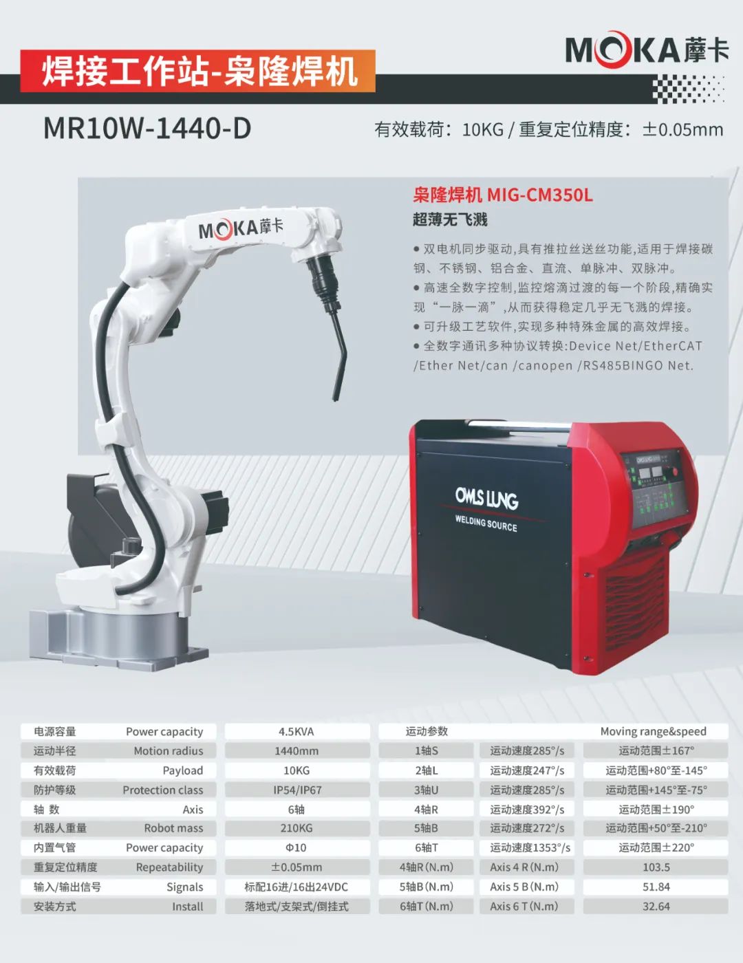 MR10W-1440-D機器人重復定位精度可達±0.05mm,有效載荷為10kg,運動半徑達1440mm,可應用于氣保、氬弧、激光、鋁、不銹鋼、碳鋼等焊接領域。