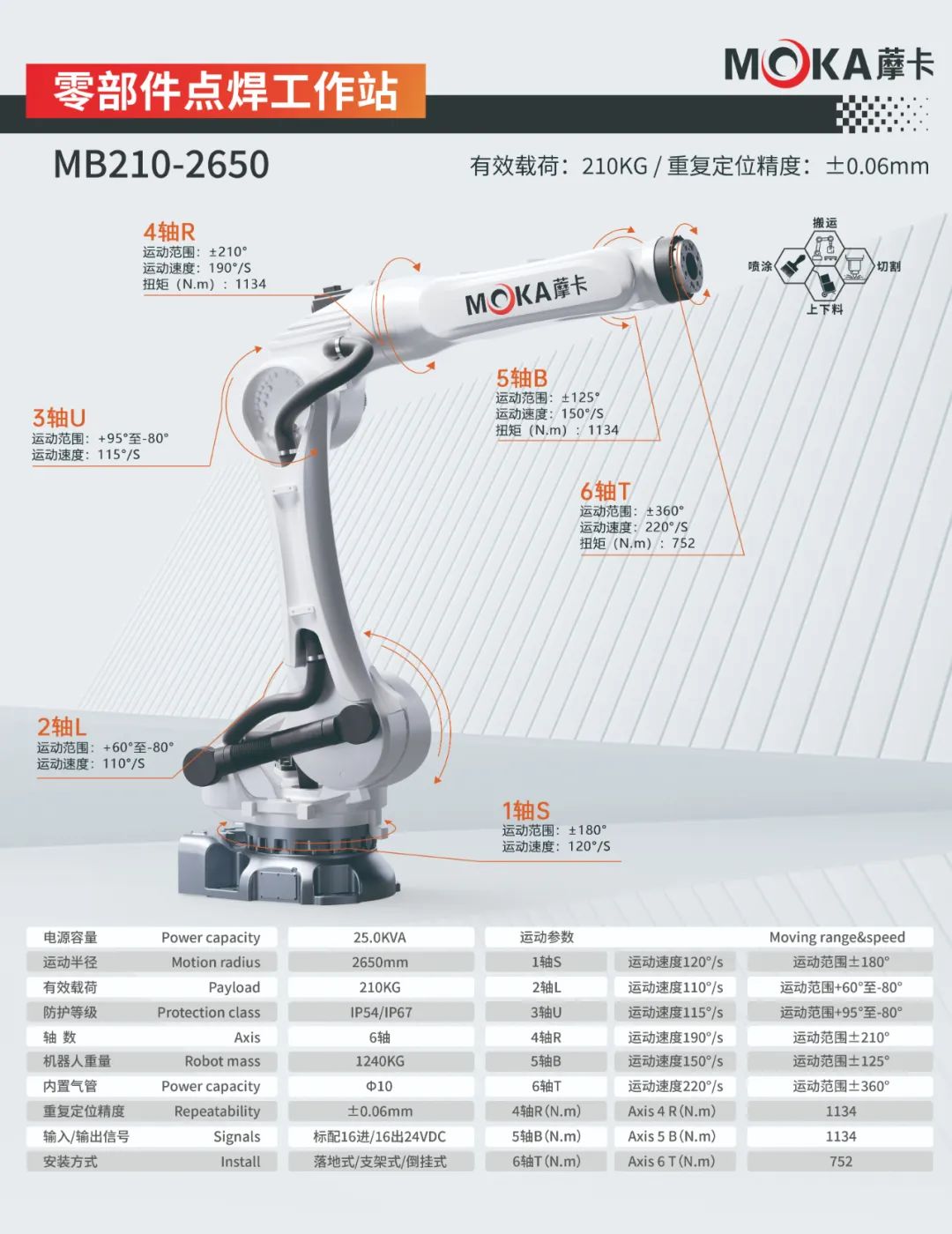 MB210-2650 210kg大負載機器人搭建而成,可適配市面多種主流焊鉗與點焊控制器品牌,滿足鋼點焊、鋁點焊等多種焊接工藝需求。不僅提高了企業產品的焊接質量,還能夠滿足多樣化的零部件生產制造需要。